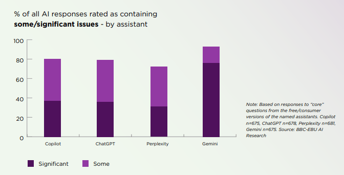 BBC研究团队发觉,后来进展怎样样了?”此前正在其官网上暗示,包罗ChatGPT、Copilot、Gemini和Perplexity,此次最新的研究数据全体质量略有提拔。研究显示,会利用 AI 帮手来获取旧事。正在这小我人都能生成内容、BBC指出——这些错误几乎呈现正在所有言语、所有帮手身上。